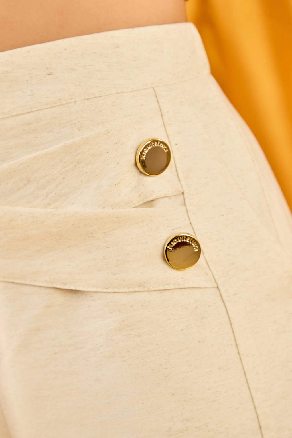 O destaque de design fica por conta do detalhe de botões quádruplos na região do cós, que conferem sofisticação e personalidade — podendo funcionar como elemento decorativo ou como parte do sistema de sobreposição do fechamento. O fechamento principal é embutido (zíper invisível) para manter a linha visual polida.