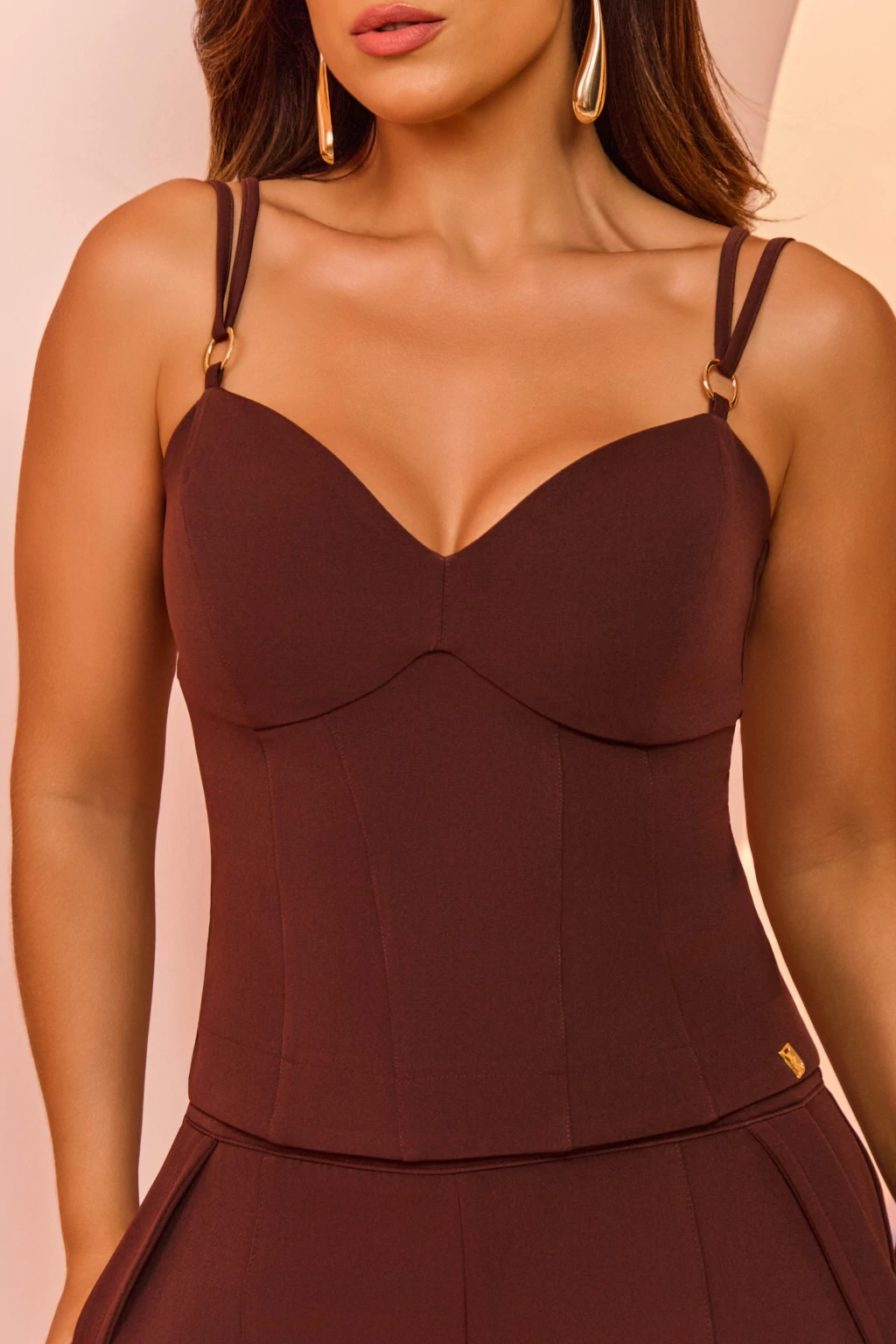 O design destaca o busto com recorte sutil estilo corset, valorizando a silhueta de forma elegante sem abrir mão do conforto. As alças duplas ajustáveis garantem sustentação personalizada, e contam com argolas metálicas douradas, que adicionam um toque de charme contemporâneo à peça.