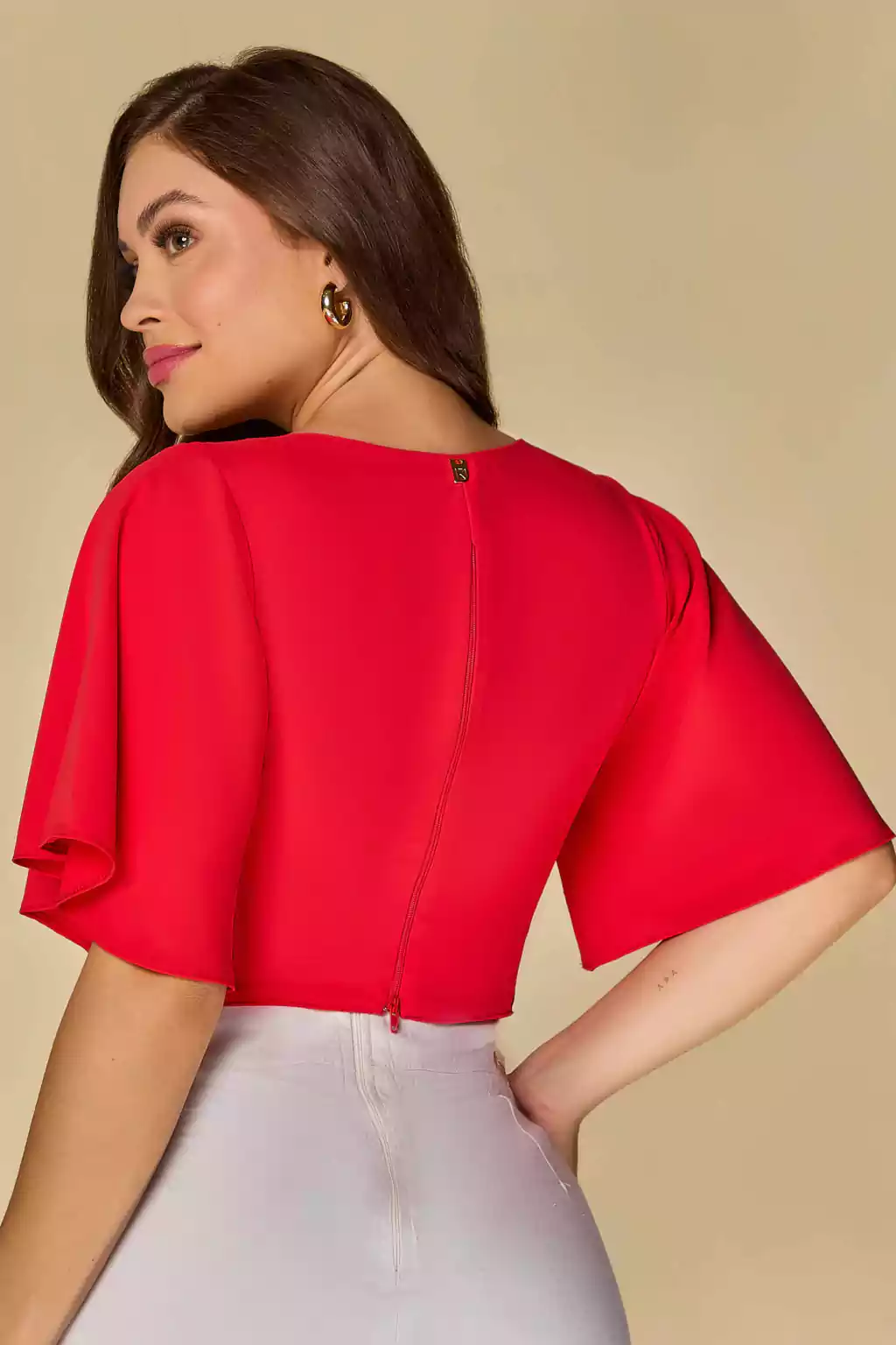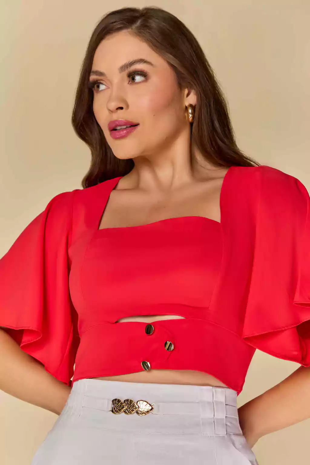 Experimente a sofisticação e o charme do Cropped com Manga Detalhe Pala com Botões. Esta peça é confeccionada em crepe de visco, um tecido leve e fluido que proporciona conforto e elegância. Com um decote quadrado que valoriza o colo, é ideal para diversas ocasiões.